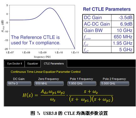 USB的官方組織規(guī)定了USB3.0使用的CTLE均衡器的參數(shù),如下圖7左上部分為均衡器的頻響,右上方的表格是均衡器的參數(shù),下方是力科示波器中集成了USB3.0的均衡器參數(shù),可方便調(diào)用。