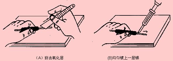 在刮凈的引線上鍍錫。可將引線蘸一下松香酒精溶液后,將帶錫的熱烙鐵頭壓在引線上,并轉動引線。即可使引線均勻地鍍上一層很薄的錫層。導線焊接前,應將絕緣外皮剝去,再經過上面兩項處理,才能正式焊接。若是多股金屬絲的導線,打光后應先擰在一起,然后再鍍錫。
