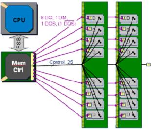 DDR2在DDR的基礎(chǔ)上將芯片接口時鐘頻率提高一倍并將工作電壓從2.5V降低至1.8V,從而使其能在相對更低的功耗下獲得更高的傳輸速率。一般情況下,DDR2的輸入時鐘頻率覆蓋200/266/333/400/533MHz,傳輸比特率覆蓋400/533/667/800/1066Mb/s/pin。相對于DDR,由于速度的提升,DDR2在主板設(shè)計要求上也有所變化。內(nèi)存控制器每Channel可級聯(lián)的DIMM數(shù)從DDR時期的4到8條減少至2到3條,數(shù)據(jù)線(DQ)上的終端電阻從主板上的分立電阻搬移到了DRAM芯片內(nèi)部(ODT),數(shù)據(jù)同步信號(DQS)由單端信號變?yōu)閱味嘶虿罘挚蛇x信號。DDR2主板系統(tǒng)架構(gòu)如右圖所示。