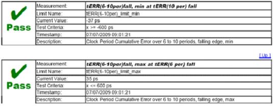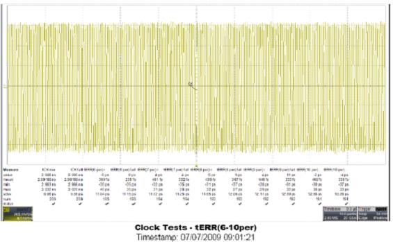 JEDEC標準要求測量n分別為2、3、4、5、6-10、11-15時tERR(n per)的最大及最小值。對于這樣的要求,如果要用手工測量將是非常耗時且低效率的。力科QPHY-DDR2軟件包的時鐘測量部分支持上述所有參數(shù)的自動測量,僅需使用一根差分探頭將時鐘信號接入示波器即可完成所有的測量工作,測量后的所有參數(shù)結(jié)果及對應(yīng)波形將列在自動生成的測試報告中并與JEDEC標準中門限值進行比較。如下圖為使用QPHY-DDR2測量tERR(6-10 per)時的部分結(jié)果與對應(yīng)波形。
