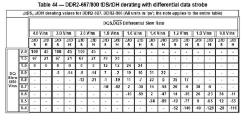 時序測試部分主要對DDR2數(shù)據(jù)、時鐘及控制線上各種時序進行測量,包括數(shù)據(jù)輸入建立/保持時間、數(shù)據(jù)輸出保持時間、數(shù)據(jù)讀/寫時DQS前導(dǎo)/后續(xù)時間、時鐘半周期寬度、DQS輸入高/低脈沖寬度等等二十余項參數(shù)。其中,在對數(shù)據(jù)輸入建立/保持時間(tDS、tDH)進行測量時,JEDEC標準規(guī)定需要根據(jù)寫數(shù)據(jù)時的DQ及DQS信號斜率對測得的建立保持時間進行修正。下表為JEDEC標準中對應(yīng)DDR2 667/800的輸入建立/保持時間修正參數(shù)表。例如,寫操作時當DQ測得的斜率為1.5V/ns,DQS斜率為3.0V/ns時,測得的DQ – DQS建立/保持時間需要加上67ps的修正值之后方能與標準中規(guī)定的最小建立/保持時間相比較。