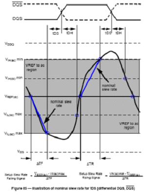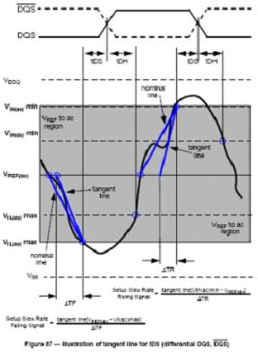 為了在上表中查到對應(yīng)的修正值,需要首先得出相應(yīng)信號的斜率。JEDEC標準規(guī)定了兩種斜率計算方法,即直連斜率norminal slew rate和切線斜率tangent slew rate,分別在不同數(shù)據(jù)波形時采納。兩種斜率計算方法如下圖所示。