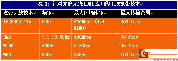 目前,有如表-1中所列幾種針對高清顯示器和投影儀的寬帶無線技術。