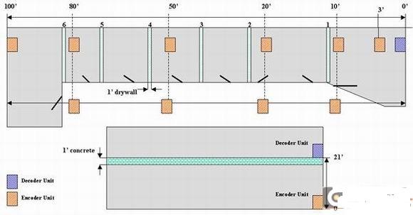 相對于可視距離的無線通信的應用,802.11n可實現更遠距離的(非可視距離)的多媒體通信,比如在家里的不同房間之間的音視頻通過無線播放。我們用標準的802.11的產品用來測試,證明魯棒性很好,可以穿越墻壁和混凝土樓板,圖-1是測試環境圖示,用SONY的PS3游戲機作為高清的視頻源,源和顯示設備之間距離100英尺并穿越6面墻,視頻的內容包括游戲和電影視頻。表5是測試結果,一組是編碼端和解碼端都是2x3MIMO(2個發送天線和3個接收天線)的無線設備,另一組采用編碼端2x3MIMO,接收端2x2MIMO的無線設備。WW602編碼用20Mbps碼流的圖像質量可超越高清電纜傳輸的6-15Mbps的圖像質量。