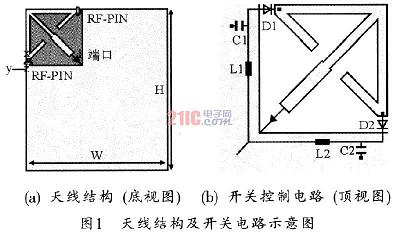 通常的天線版圖位于介質基片的底面,控制電路位于基片的頂面,圖l中的D1、D2為兩個RF-PIN開關;Cl、C2為旁路電容,對高頻信號短路;L1、L2為電感,對高頻信號開路。二極管和電容通過通孔與底面的天線連接。該天線基片采用厚度為0.8mm,介電常數為4.4的FR4材料。水平與垂直的兩個微帶結構通過RF-PIN開關與電路板地相連,中間的微帶為饋線,并通過同軸電纜直接饋電。微帶天線的諧振頻率主要取決于微帶線的長度,在一般情況下,在介電常數為εeff的基片上,微帶線的波導波長約為: