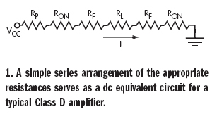 有兩個晶體管“開”的典型的D類放大器的直流等效電路只是一連串的串聯電阻:RON,每個晶體管的輸出傳導損耗;RP,金屬互連線,引線結構和PC板走線的附加電阻;PL,負載電阻(圖1)。另一個產生功耗的是輸出電阻中的開關延遲(圖2)。整個系統的效率使可以估算如下: