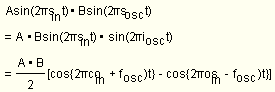 假設此二個信號為Asin(2fint)與Bsin(2fosct),將此經過乘算電路后,根據三角函數的公式,可以得到原來頻率的和與差頻率的信號。