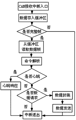 當(dāng)CPU檢測到溫度出現(xiàn)異常,會根據(jù)溫度異常范圍向上位機發(fā)出溫度異常警報,這是該節(jié)點CPU唯一主動向上位機發(fā)出的數(shù)據(jù)幀。該節(jié)點的溫度相關(guān)數(shù)據(jù)存放在緩沖區(qū),在沒有收到上位機數(shù)據(jù)請求的時候,該緩沖區(qū)的數(shù)據(jù)會不斷的被新的數(shù)據(jù)刷新,以保證該節(jié)點數(shù)據(jù)的實時性,中斷流程如圖5所示。