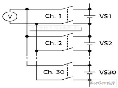 圖1給出了切換伏特計(jì)到多個(gè)串聯(lián)的30電壓源(VS)的情形。為了避免其中一個(gè)或多個(gè)發(fā)生短路,必須在關(guān)閉一個(gè)通道之前打開另一個(gè)通道(操作前斷開)。此外,要給每個(gè)電壓源串聯(lián)熔絲,避免超過卡的共模額定電壓。在這個(gè)例子中,每個(gè)電源都是12V,整個(gè)串聯(lián)電源的總電壓為360V。最好采用至少500V的通道-通道額定電壓和共模額定電壓。