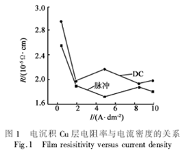 圖1是電沉積Cu層電阻率與電流密度之間的關(guān)系。可見,脈沖電鍍得到的Cu鍍層電阻率小于相同電流密度下的直流鍍層。在小電流密度時(<2A/dm2),直流鍍層和脈沖鍍層的電阻率都較大。