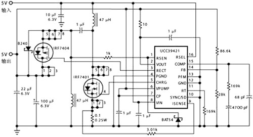 圖1就是一種SEPIC實用電路,其輸入、輸出電壓均為5V,開關(guān)頻率約300kHz,電源變換效率接近90%。其中,UCC39421是一種多用途高效PWM控制器,開關(guān)頻率可由其“定時電阻(RT)”引腳的外接電阻調(diào)整,輸出電壓則取決于“反饋(FB)”端的電壓采樣分壓器,外接N溝道與P溝道MOSFET分別用作功率開關(guān)與同步整流。特別值得注意的是,圖中的儲能電感分成對稱的兩半,輸入端的能量經(jīng)由跨接于兩個電感之間的電容器向輸出端轉(zhuǎn)移,這是SEPIC電路的主要特征。