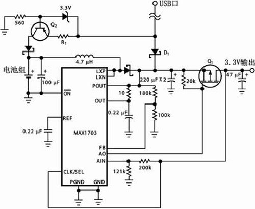 不少便攜式USB設(shè)備脫離主機后改由內(nèi)部電池組通過直流變換器繼續(xù)供電,故而需要配備一個小型UPS電源,圖3便是一種由單片開關(guān)電源MAX1703構(gòu)成的實用電路。該集成器件采用同步整流PWM升壓型電路結(jié)構(gòu);可以單節(jié)鎳鎘/鎳氫電池供電,最低輸入電壓0.7V,輸出電壓可調(diào)范圍為2.5~5.5V,最大輸出電流1.5A,電源變換效率可達95%。圖3中,MAX1703開關(guān)電源“POUT”端的輸出電壓設(shè)定為3.4V,而由P溝道場效應(yīng)管Q1與片內(nèi)備用放大器構(gòu)成的線性穩(wěn)壓器輸出電壓為3.3V,故而USB外設(shè)由電池組供電時Q1的功率損耗幾乎可以忽略。外部設(shè)備與USB口接通時,二極管D1為正向偏置而使開關(guān)電源處于“空閑”狀態(tài);也就是只要Q1的源極電壓高于3.4V,外部設(shè)備便始終由USB口供電。與此同時,USB口還通過PNP晶體管Q2等組成的恒流源向電池組充電,調(diào)整電阻R1的阻值可以設(shè)定充電電流,使之符合十小時充電制的要求。一旦外部設(shè)備脫離USB口,開關(guān)電源便會立即退出“空閑”狀態(tài)而由內(nèi)部電池組繼續(xù)供電。
