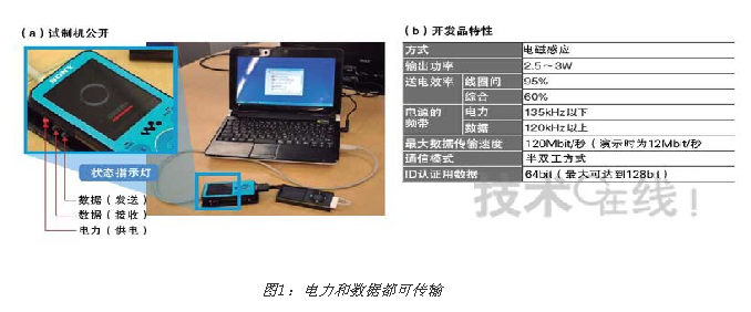 公開了使用索尼“Walkman”和蘋果“iPod nano”的試制機(jī)(a)。可將最大120Mbit/秒的數(shù)據(jù)與電力一起進(jìn)行傳輸(b)。[page]