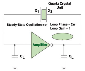 如果皮爾斯拓撲結構的非線性增益大于某個最小值,而且非線性延時提供了滿足接近石英晶體單元串聯諧振頻率相移條件的足夠相移,它就可以很好地使振蕩頻率接近石英晶體串聯諧振頻率而使振蕩器進入穩態。如果振蕩能夠滿足這些條件,當放大器延遲改變時,輸入/輸出放大器的波形幅值包跡將隨著時間增加,直到穩態振蕩條件得到滿足。在許多情況下,當峰峰值輸出幅值達到供電電壓和地之間的差值時,放大器增益就可以達到一個基本不變的穩態值。