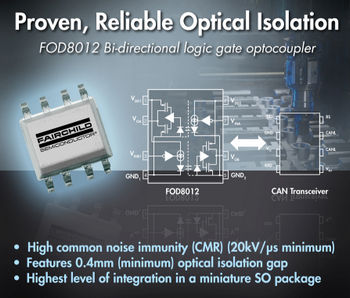 為幫助設(shè)計人員應(yīng)對挑戰(zhàn),飛兆半導(dǎo)體公司(Fairchild Semiconductor)開發(fā)出業(yè)界首款全雙工、雙向邏輯門光耦合器FOD8012,它具有高抗噪能力和經(jīng)驗證的可靠光隔離性能,適用于工業(yè)現(xiàn)場總線通信、可編程邏輯控制、伺服控制,以及逆變器、工廠自動化、過程控制和測試測量等應(yīng)用。