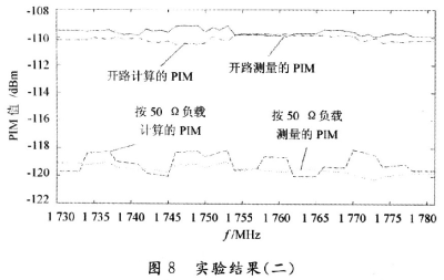 由以上的分析可知,這種計算方法計算出來的PIM值和真實的PIM值十分接近,并且隨頻率的變化趨勢一致。同時可以看出,在開路的時候所測量的 PIM明顯要比接負載的時候所測量的PIM要大,增大的PIM值是因為匹配不好所造成,當然,相同的負載狀況在不同的頻率下呈現的匹配狀態是不一樣的。