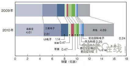 2010年的手機全球銷量比上年增加31.8%,約為16億部。RIM、蘋果、ZTE、HTC以及華為的銷量順利增長,但LG、索尼愛立信和摩托羅拉移動等的銷量則出現減少。(圖:Gartner,2011年2月發行)