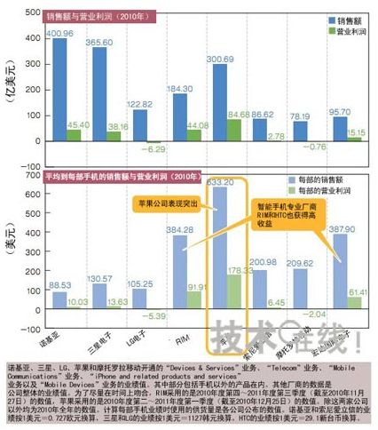 各大廠商的2010年手機業務全年業績。諾基亞在按銷售額的排名中位居榜首,不過在按營業利潤的排名中,蘋果以將近2倍的差遙遙領先于位居第二的諾基亞。換算到每部手機上,蘋果的銷售額和營業利潤較其他公司高出很多。