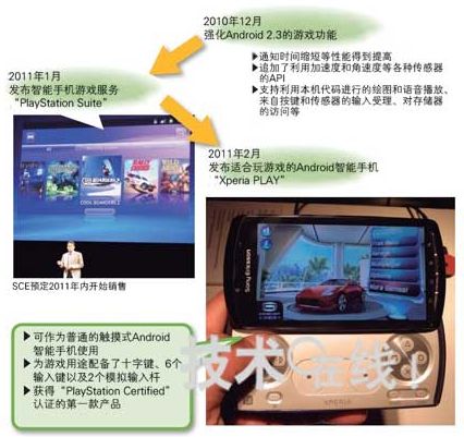 在Android的商業生態系統上開發具有魅力的服務,然后向適合該服務的智能手機提供。指明這一方向的是日本與瑞典的合資公司索尼愛立信移動通信(Sony Ericsson Mobile Communications AB)。作為利用索尼計算機娛樂(以下稱SCE)游戲品牌“PlayStation”邁出的第一步,該公司發布了在滑蓋機身上擁有與游戲機控制器相同輸入鍵的Android智能手機“Xperia PLAY”。