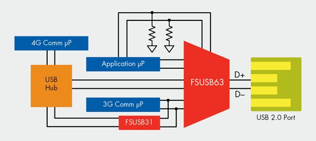 4G手機(jī)的最新趨勢(shì)是在手機(jī)中集成兩個(gè)處理元件,同時(shí)訪問USB端口。對(duì)于這種應(yīng)用,一個(gè)比較好的選擇是采用集線器。不過麻煩在于USB集線器的接線通常是電容性的,功耗相當(dāng)大;而另一方面,同時(shí)訪問USB端口的機(jī)會(huì)又不多。圖2所示為這種手機(jī)的一種設(shè)計(jì)方法,其中,3G通信處理器必需與4G處理器分開來單獨(dú)訪問USB端口。通過一個(gè)隔離開關(guān)(FSUSB31),并采用極短的PCB引線,可以盡量減小電容。這樣一來,在從3G通信處理器到USB主設(shè)備的路徑上,一個(gè)高速發(fā)射USB數(shù)據(jù)眼(data eye)與USB規(guī)范相比有很大的裕量。在這個(gè)例子中,應(yīng)用處理器控制USB 3:1多路復(fù)用開關(guān),當(dāng)后者在待機(jī)模式下處于低電狀態(tài)時(shí),它可以讓自己的控制線路上的上拉和下拉電阻連接到默認(rèn)的應(yīng)用處理器。