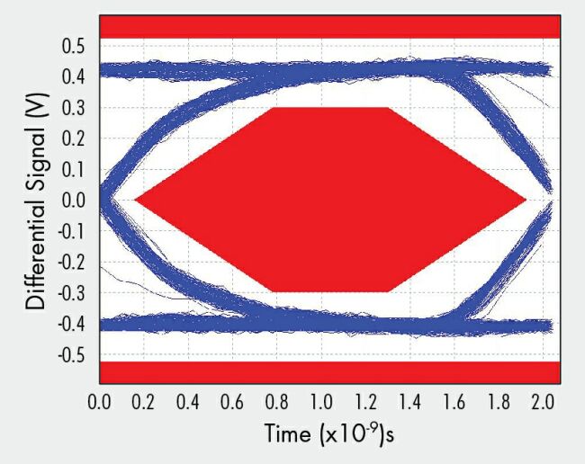 對(duì)于大多數(shù)集成電路而言,高速和低功耗一般是一對(duì)相互矛盾的特性。能夠兩者兼具的解決方案常常需要降低電壓,并使用精細(xì)的幾何工藝尺寸;然而,USB規(guī)范要求的是高電壓信號(hào)。在性能穩(wěn)健的手機(jī)設(shè)計(jì)中,D+和D-信號(hào)能夠承受至5V VBUS信號(hào)線的短路,故限制了低電壓解決方案。不過,最近推出的低功耗電荷泵USB開關(guān)解決了這個(gè)問題,并滿足嚴(yán)苛的USB發(fā)射眼圖要求,如圖3所示。事實(shí)上,無需對(duì)架構(gòu)或所選器件做任何修改,大多數(shù)這類設(shè)計(jì)的工作速率就能夠達(dá)到高速USB數(shù)據(jù)速率(> 1 Gbps)的兩倍以上。