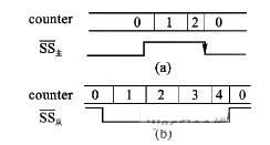 對從模式(MSTR=0),在沒有數(shù)據(jù)傳送的時(shí)候,SS高電平表示從器件未被選中,從器件不工作,MISO輸出高阻;在數(shù)據(jù)傳輸過程中,片選信號SS必須接低電平,且SS不允許跳變。如果SS從低電平跳到高電平,在SS的上跳沿,SPI模塊也將檢測到模式錯(cuò)誤,清空內(nèi)部計(jì)數(shù)器counter,并結(jié)束正在進(jìn)行的數(shù)據(jù)傳輸。直到SS恢復(fù)為低電平,重新使SPEN=1時(shí),才重新開始工作,如圖6(b)所示。
