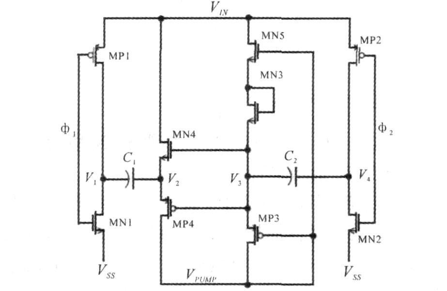 自舉電荷泵不需要為MN2和MP2提供柵驅動電壓,控制簡單,但輸出電壓會有一個閾值損失。圖3是改進后的電荷泵電路圖,1和2為互補無交疊時鐘。由MN2、MN5、MP3、MP2和電容C2組成的次電荷泵為MN4、MP4提供柵壓,以保證其完全關斷和開啟。當1為低電平時,MP1導通,電位增加,此時,V3電位為零,MP4導通,V2上的電荷轉移到柵電容CGATE上,VPUMP電位升高。當1為高電平時,MP2導通,為C2充電,V4電位上升至電源電位,V3電位隨之上升,MP3導通,VPUMP電位繼續升高。MN3相當于二極管,起單向導電的作用。