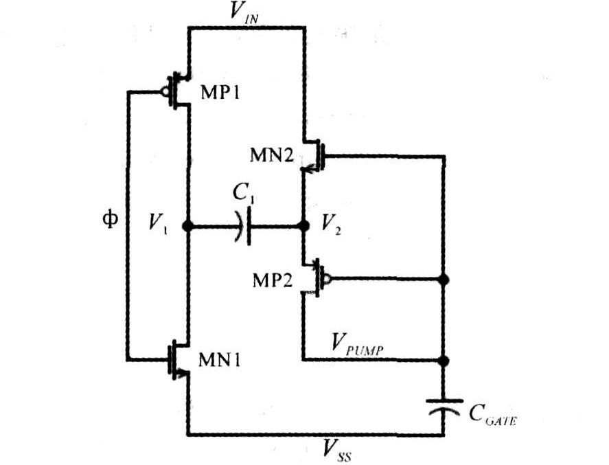 圖2為一種自舉型(SelfBoost)電荷泵的電路原理圖。圖中,為時鐘信號,控制電荷泵工作。初始階段電容,C1和功率管柵電容CGATE上的電荷均為零。當為低電平時,MP1導通,為C1充電,V1電位升至電源電位,V2電位增加,MP2管導通。假設柵電容遠大于電容C1,V2上的電荷全部轉移到柵電容CGATE上。當為高電平時,MN1導通,為C1左極板放電,V1電位下降至地電位,V2電位下降,MP2管截止,MN2管導通,給電容C1右極板充電至VIN。在的下個低電平時,V1電位升至電源電位,V2電位增加至2VIN,MP2管導通,VPUMP電位升至2VIN-VT。