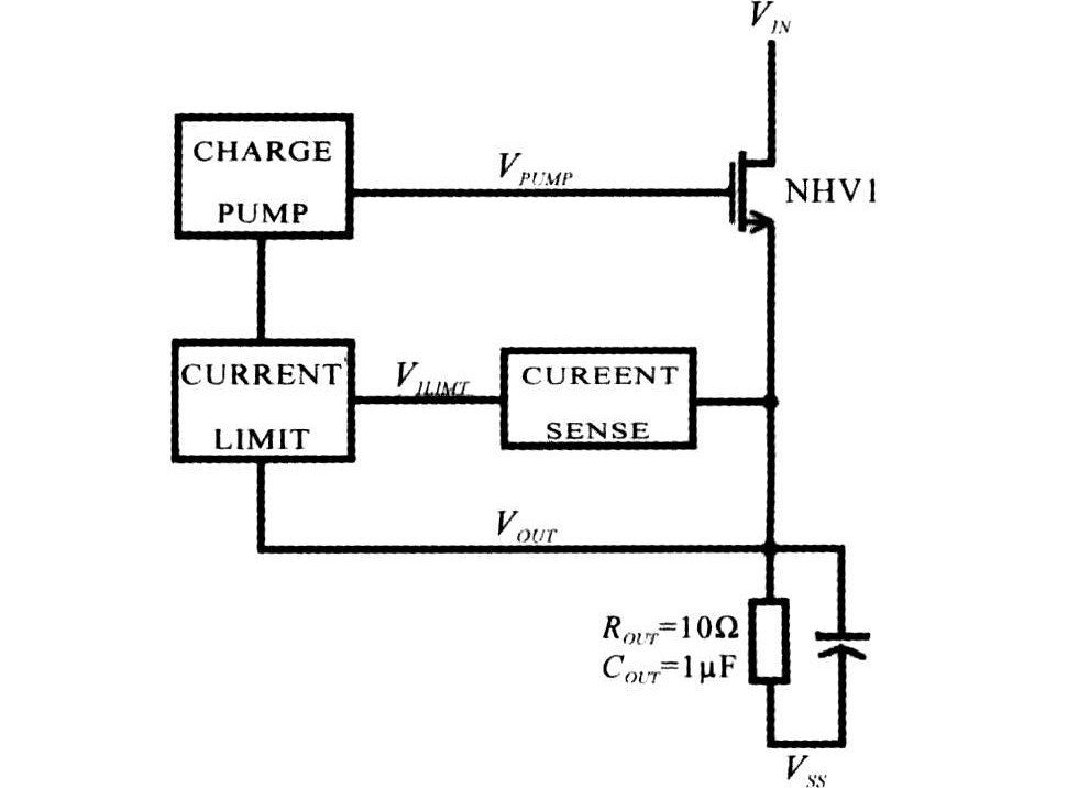 圖1為USB電源開關的整體設計。其中,VIN為電源輸入,VOUT為USB的輸出。在負載正常的情況下,由電荷泵產生足夠高的柵驅動電壓,使NHV1工作在深線性區,以降低從輸入電源(VIN)到負載電壓(VOUT)的導通損耗。當功率管電流高于1A時,Currentsense輸出高電平給過流保護電路(Currentlimit);過流保護電路通過反饋負載電壓給電荷泵,調節電荷泵輸出(VPUMP),從而使功率管的工作狀態由線性區變為飽和區,限制功率管電流,達到保護功率管的目的。當負載恢復正常后,Currentsense輸出低電平,電荷泵正常工作。