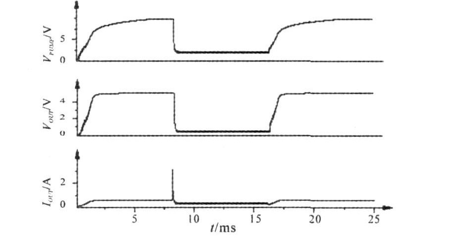 圖5為負載正常情況下負載輸出電壓和功率管電流的仿真波形。電源電壓為5V,C1、C2電容值為1pF,時鐘周期為40s,NHV和MP6寬長比的比值為300,功率管的并聯個數為1103。采用0.6m30VBCD工藝,在典型條件下,用HSPICE對整體電路仿真。由波形可以看出,在1ms內,負載輸出電壓逐漸上升,功率管電流沒有過沖,啟動時間為1.7ms。3ms后,功率管完全開啟,為負載提供電源。