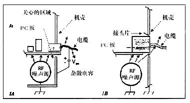 即使工程師采取許多上述所列的預防措施,來減小在I/O區內的RF噪聲,還不能保證這些預防措施能否成功地足夠滿足發射要求。有些噪聲是傳導干擾,即在內部電路板上按共模電流流動。這個干擾源是在底板和電路等之間。于是,這個RF電流一定通過最低阻抗(在底板和載信號線之間)的通路流動。如果連接器沒呈現足夠低的阻抗(與底板的搭接處),這RF電流經雜散電容流動。當這RF電流流過電纜時,不可避免地產生發射(圖1A)。