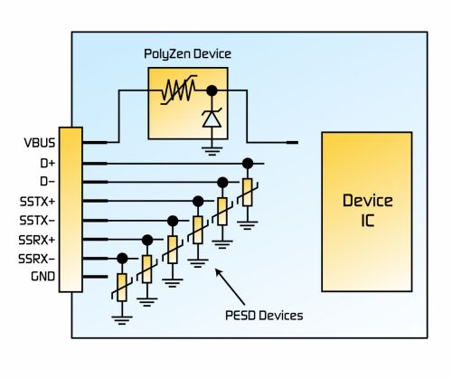 對于USB 3.0設(shè)備,PolyZen器件可安裝在USB輸入端口的VBUS上、Powered-B插頭的DPWR端口、桶形插座電源端口、以及USB集線器的VBUS輸入端。