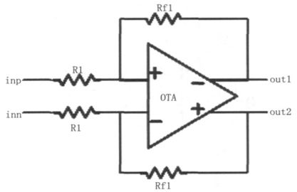 D 類音頻功率放大器的輸入放大級是基于運算放大器(OTA)的閉環結構來實現的,其結構如圖4所示,用來根據需要對輸入的音頻信號作電平調整和信號放大處理,使輸入信號在幅度方面能滿足后級電路的要求,輸入放大級的增益可以通過設置Rf1和R1 的阻值來決定。