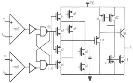 本文采用的三角波產生電路結構如圖6 所示,其中m5、m6 和m7、m8 構成了兩組恒流源,m9~m13 和Q1 構成了輸出級。在電路中,采用將輸出信號VT 分別反饋到比較器comp1 和comp2,與參考電平VREF1 和VREF2(VREF2<VREF1)進行比較,并通過一組數字電路產生兩路反向的時鐘信號clk 與clk0,來控制m2 和m3 的開啟和關斷,從而達到對電容C 進行充放電,產生三角波信號VT 的目的。