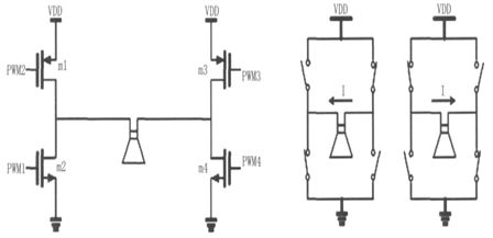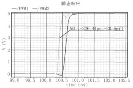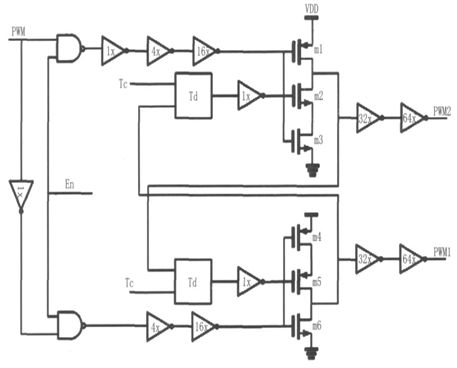 驅動電路結構如圖8 所示,該電路能有效調節死區時間(N 型、P 型功率開關管同時關斷),防止單臂"shoot- through"現象,并有保護關斷功能。輸入信號為比較器輸出的PWM 脈沖信號,PWM1用來驅動N 型功率開關管,PWM2 用來驅動P 型功率開關管。為了避免全橋開關電路中的單臂"shoot- through"現象,當PWM 信號從低電平變為高電平時,PWM2 應首先變為高電平, 關斷PMOS 功率開關管,隨后PWM1 再變為高電平,開啟NMOS 功率開關管,如圖9 所示;反之,當PWM 信號從高變為低時,PWM1 先變為低電平,關斷NMOS 開關功率管,隨后PWM2 再變為低電平,開啟PMOS 開關功率管。實際電路中,可以根據需要通過控制延遲單元的控制位Tc 來調整死區時間的長短。為減小失真,必須減小死區時間,該驅動電路采用了逐級增加驅動能力的方式來驅動功率管,從而減小了必要的死區時間,保證了低失真度。