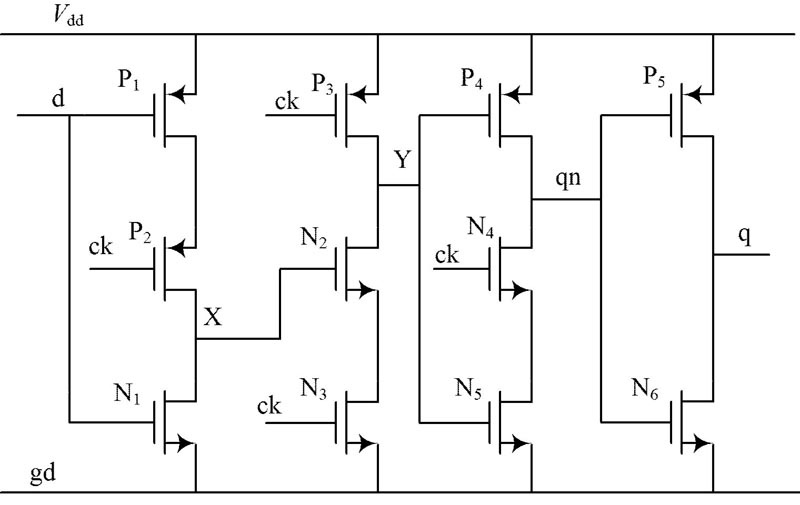 TSPC 電路構(gòu)成的觸發(fā)器如圖3 所示, 由圖中可以看出, 該電路由四級反相器構(gòu)成, 上升沿觸發(fā), 當(dāng)CK 為低電平, 輸入反相器在節(jié)點X 上采樣反向d 輸入,第2 級反相器處于保持狀態(tài), 節(jié)點Y 預(yù)充電至V dd,第三級反相器處于保持狀態(tài), 時鐘上升沿來時, 第二級反相器求值, Y 的電平值發(fā)生變化, 時鐘ck 為高電平時,節(jié)點Y 的值傳送到輸出q, 該觸發(fā)器的延時為4 個反相器的傳播延時, 由于電路中元件數(shù)目很少, 而且采用動態(tài)邏輯, 因此功耗極低。