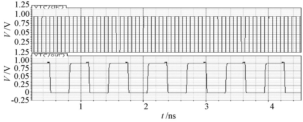 采用Cadence 公司的spect re 仿真器對設(shè)計的分頻器分別仿真, 仿真電源電壓為1 V, 結(jié)果表明: 在典型工藝參數(shù)條件下,基于CML 電路結(jié)構(gòu)的五分頻器最大工作頻率是8 GHz, 最小工作頻率是1 kHz, 當(dāng)工作在8 GHz 時, 功耗為1. 7 mW, 輸出信號占空比為49. 76% ; 基于T SPC 電路結(jié)構(gòu)的五分頻器最大工作頻率是10 GHz, 最小工作頻率是10 MHz, 當(dāng)工作在10 GH z時, 功耗采用10 ns 內(nèi)的平均功耗, 功耗為0. 2 mW, 輸出信號占空比為49. 92%.由于是單端輸入輸出, 基于T SPC 電路結(jié)構(gòu)的分頻器抗噪聲能力較弱。最高工作頻率下的仿真結(jié)果如圖4, 圖5 所示。