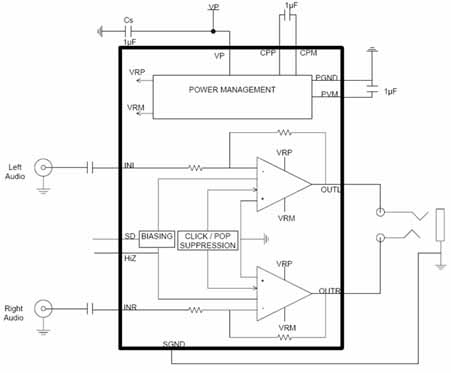 圖4:NCP2815“長播放時間”立體聲耳機放大器框圖。