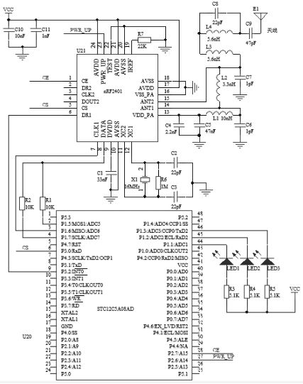 nRF2401 是一個單片無線收發一體芯片,工作在2.4GHz ISM 頻段,完全集成功率合成器、功率放大器、晶體振蕩器和調整電路。采用QFN24 5×5 毫米封裝,應用電路使用外圍元件少(見圖2);采用FSK 調制方式,125 個頻道,能滿足多頻及跳頻需要;傳輸速率高達1Mbps,具有高數據吞吐量;功耗低,電源電壓1.9V~3.6V 滿足低功耗設計需要;芯片內部設有專門穩壓電路,使用各種電源包括DC/DC 開關電源均有較好的通信效果。