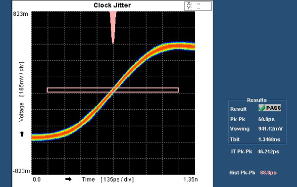 任何傳輸系統最關心的問題都是時鐘抖動,抖動測試的目的就是檢查并確保時鐘信號中沒有過多的抖動。例如,占空比抖動測量就是評估時鐘確定性抖動的一種很好的方法。CTS規定,在50%的標稱占空比附近可以有+10%的變化裕量。但應注意,此處所說的占空比變化是指在大量捕獲信號的基礎上進行測量得到的結果。因為CTS規定,測量占空比變化至少需要一萬個觸發波形。這樣一來,示波器的觸發再準備速率(Trigger re-arm rate)就變成最重要的一個因素。一般情況下,觸發再準備速率約為每秒100個波形(wfms/s)。