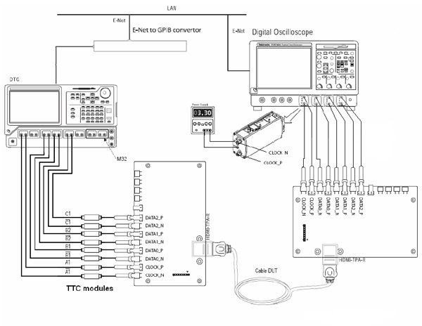 該例中,數字熒光示波器通過一條GPIB電纜與TMDS信號發生器DTG5334相連,需要時還可通過一條GPIBUSB-B電纜將其與抖動插入信號發生器AWG/AFG相連。HDMI設計與測試工程師可以在一套閉環裝置中控制這些信號發生器,利用示波器上自帶的“一鍵運行”一致性測試軟件自動實現復雜的電纜和接收器測試。該例中采用的閉環裝置大大縮短了測試時間,也消除了測試裝置的非線性。