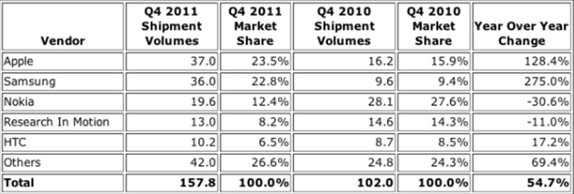 • 2011年第4季度全球智能手機銷量同比增長了54.7%