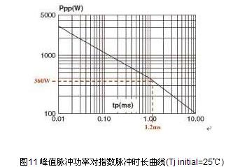 我們要解決的問(wèn)題是根據(jù)所要消除的電涌來(lái)確定保護(hù)元器件的參數(shù)。以圖8中的ISO7637-2 脈沖2為例,不難看出,抑制器上的鉗制電壓大約是30V,峰值脈沖電流 (Ip)大約是12A,在Ip/2點(diǎn)測(cè)得電流脈沖時(shí)長(zhǎng)(tp)是4μs。因此,可判定TVS必須消耗360W的最大脈沖功率(Pp) 。所有這些Pp、Ip和tp值是有用的,因?yàn)樗鼈兛梢詭椭容^TVS數(shù)據(jù)表中的峰值脈沖功率對(duì)指數(shù)脈沖時(shí)長(zhǎng)的曲線,以確保TVS在應(yīng)用的限制范圍內(nèi)。