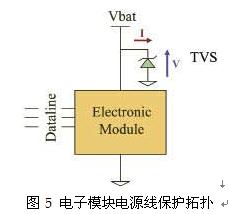 車載模塊的電源線保護(hù)是在汽車環(huán)境中需要關(guān)注的另一個(gè)問(wèn)題,這個(gè)問(wèn)題涉及ISO7637-2標(biāo)準(zhǔn)。例如,為滿足ISO7637-2標(biāo)準(zhǔn),特別是圖1中的1、2、3a和3b的脈沖要求,只使用一個(gè)瞬變電壓抑制器(TVS)即可有效保護(hù)車載模塊。