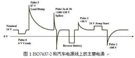 圖1簡(jiǎn)要描述了ISO7637-2和汽車電源線上的主要電涌。