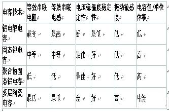 在電壓調節(jié)器中,以下三大類電容通常用作電壓輸入和輸出旁路電容:多層陶瓷電容、固態(tài)鉭電解電容和鋁電解電容下表對這三類電容進行了比較。