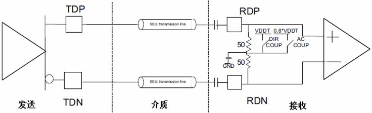 圖3是TLK3132高速串行接口的AC耦合框圖,采用CML高速電平接口,發送側內部集成了50歐姆的匹配電阻。接收端支持DC和AC耦合,若采用直流耦合時,共模電壓由發送側決定,匹配電阻直接上拉到VDDT,若采用交流耦合,為得到最優的共模偏置電壓,選擇芯片內部0.8VDDT的偏置電壓。在實際電路設計中,推薦采用交流耦合方式,容易實現不同接口的電平轉換,并可去除共模噪聲,避免外界噪聲對接收端的影響。