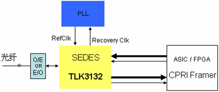 為了處理射頻模塊拉遠技術中基帶單元和射頻單元的光纖鏈接,國際上成立兩個標準化組織:一個是CPRI (Common Public Radio Interface),在2003年由華為、愛立信、NEC、西門子和北電發起成立的組織,致力于基帶、射頻接口的標準化;另一個是OBSAI (Open Base Station Architecture Initiative),由諾基亞、LG電子、三星電子等成立的聯盟。二者都定義了使基帶和射頻分離的標準化接口,也就是將宏基站分為基帶單元BBU和遠端射頻單元RRU兩部分,BBU和RRU之間傳送I/Q數據和控制管理數據,其信號格式就是CPRI或者OBSAI所定義的標準接口。本文以CPRI接口為例,詳解TLK3132在射頻模塊拉遠技術中的應用。
