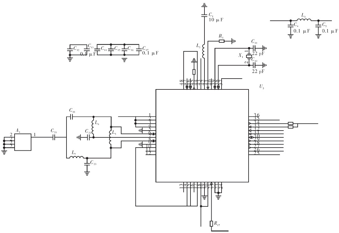 圖3中無線射頻模塊的外圍電路采用CC2420手冊提供的典型應(yīng)用電路的器件數(shù)值,這樣保證了芯片能工作在正常狀態(tài)。另外為達到最優(yōu)性能,必須使用電源去耦,去耦電容和電源過濾的設(shè)置和大小對于在應(yīng)用中獲得最優(yōu)性能起著關(guān)鍵作用,TI提供一個緊湊的參考設(shè)計,必須嚴格按照該設(shè)計進行。同時增加數(shù)字、模擬電源采用電容濾波。CC2420需要一個16 MHz的參考時鐘用于傳輸速率為250 kbit·s-1的數(shù)據(jù)收發(fā),參考時鐘可以來自外部時鐘源,也可以由內(nèi)部晶體振蕩器產(chǎn)生,這里采用內(nèi)部晶體振蕩器產(chǎn)生的方式。天線阻抗匹配至關(guān)重要,為獲得較好的發(fā)射功率,在原有基礎(chǔ)上對部分電容、電感進行了適當(dāng)?shù)恼{(diào)整。CC2420與微控制器的通信通過4線SPI總線實現(xiàn)(SI、SO、SCLK、CSn),通過控制FIFO和FIFOP管腳接口狀態(tài)可以使芯片工作在發(fā)射或接收模式,另外CCA用于空閑信道評估,SFD用于控制時鐘或定時信息的輸入。