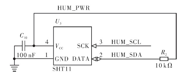SHT11電源供電要求為2.4~5.5V,電源和時鐘信號均由微處理器提供,數(shù)據(jù)線管腳三態(tài)輸出,因此需要外界一個上拉電阻將信號拉高。